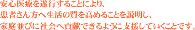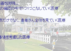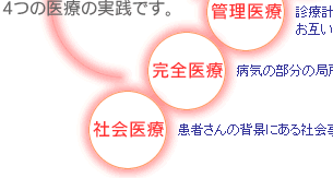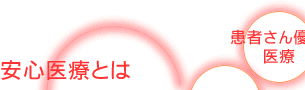 4つの医療は、患者さんの病気に対しての当院の診療方法であり、医療という枠の中で当院が最大努力していくべきものです。この理念に向けた診療を行うことにより、患者さんが「当院に通院してよかった」という結果を生み出していくものです。さらに具体的には、患者さんの“わがまま”を受け入れることではなく、病気に対する正確な知識、診療の計画、幅広い医療情報等を専門の立場から提供し、いわゆる“良い患者さん”へなっていただくように説明、教育などを行いながらお互いが有益な関係を築いていけるようにしていくことです。 また、患者さんが活用しやすい環境を提供していきます。そのためにも患者さんの来院目的を明確にしていただき、それに沿って適切に対応していくクリニカルパスを用意しています。 ※当院で使用するクリニカルパスとは診療目的直接移動システムの一つです。患者さんの来院目的に対応したもので、お互いの理解をもとに活用しやすく、待ち時間を少なくするためのものです。 |