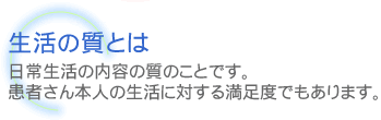![]() 例えば、病気に対し、積極的に治療を受けえることにより、痛みなどつらい症状が発生しては患者さんにとって好ましい状態とはいえません。このような状態を“生活の質”が悪いといいます。このように、治療を行う場合、副作用の問題や患者さんの症状を軽視したものは治療結果が良くても決して満足できるものではありません。 普通の方とほぼ同様の生活ができる範囲での治療内容を“生活の質”を重んじたものと評価することができます。当院はこのような治療を目指した診療体制を形作っていきます。 |